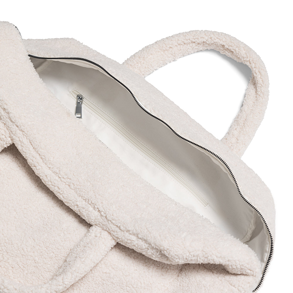 A changing bag in soft teddy fabric with a unique design that makes nappy changes as stylish as they are practical. Everything you need, always in the right place.